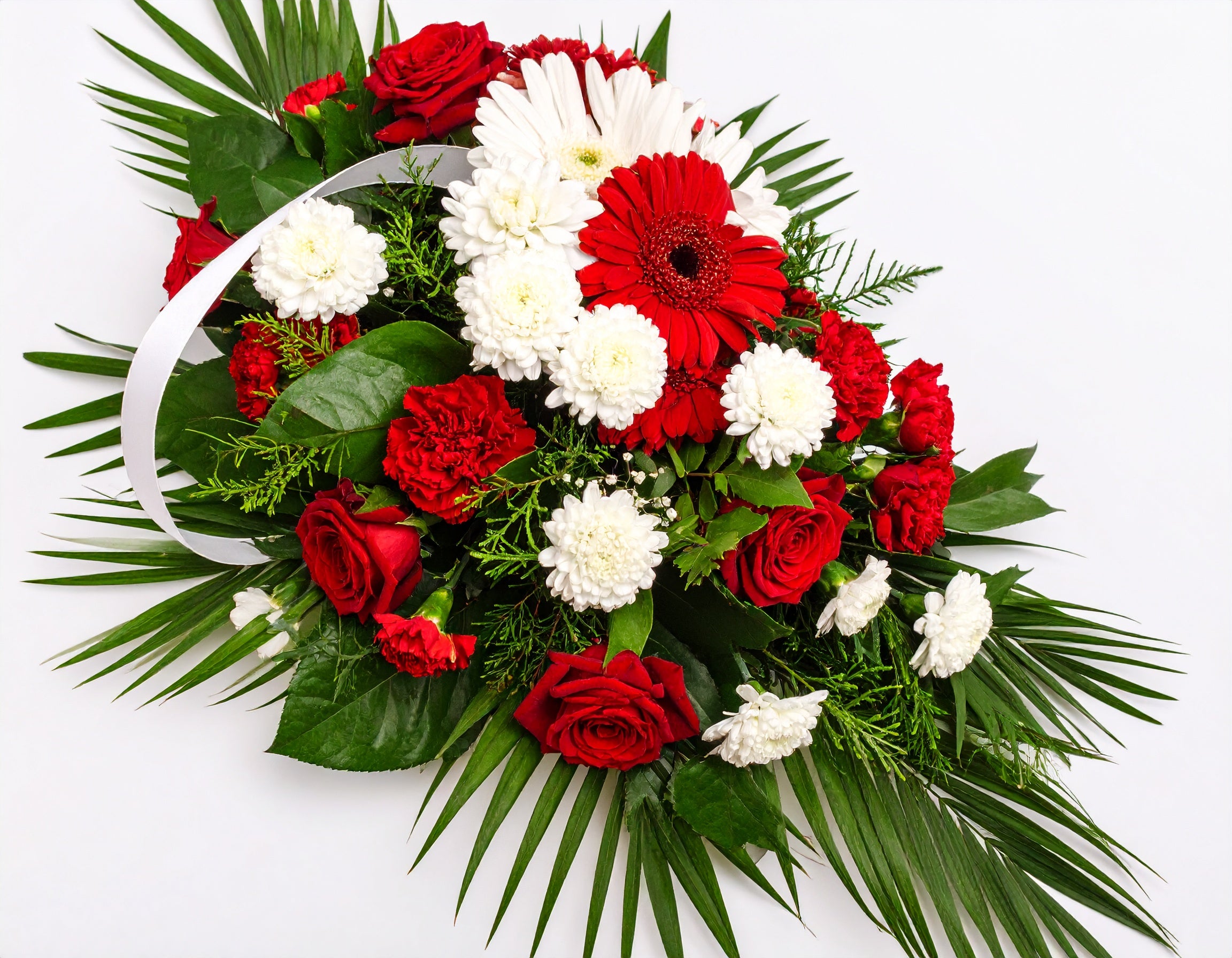 This elegant casket spray features a harmonious blend of red roses, gerberas, and carnations, complemented by white asters and lush greenery. It serves as a heartfelt tribute, providing solace and expressing deep sympathy to those mourning their loss.