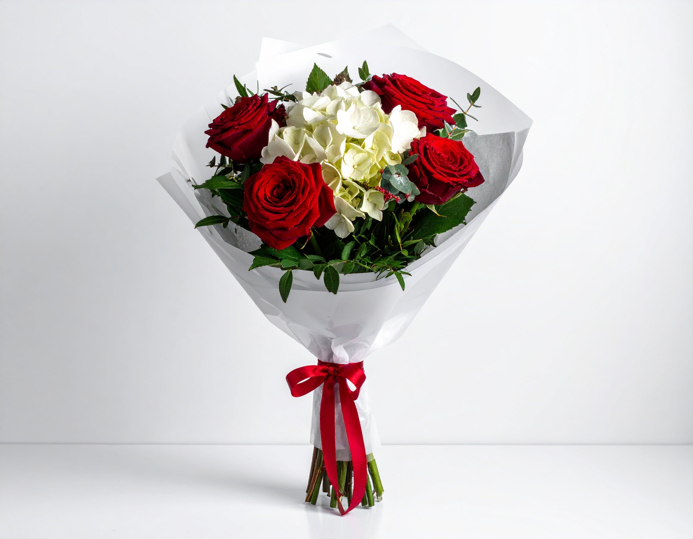 Radiant red roses embody genuine romance. Carefully chosen for their size and flawless quality, our authentic red roses are beautifully paired with pristine white hydrangeas. This arrangement represents a refined and luxurious gift, designed for someone truly exceptional.