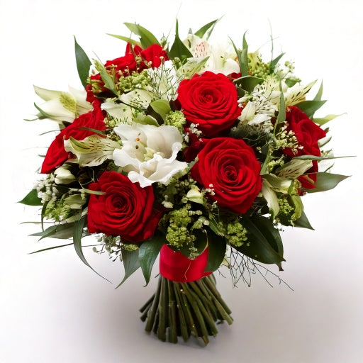 This elegant bouquet features red roses, white lilies, and red hypericum, complemented by delicate gypsophila, small green chrysanthemums, and aralia leaves for a refined look. The stem is wrapped in a red satin ribbon, perfectly enhancing the bouquet’s sophisticated design.